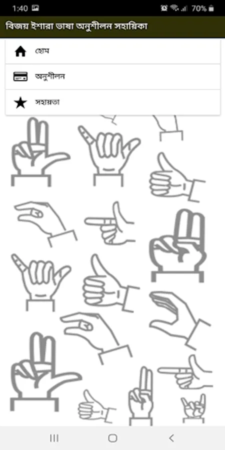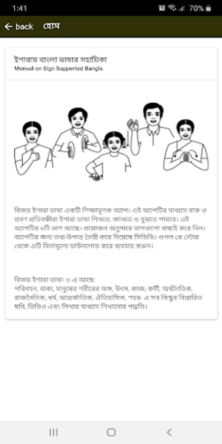 বিজয় ইশারা ভাষা একটি শিক্ষামূলক অ্যাপ। এই অ্যাপটির মাধ্যমে বাক ও শ্রবণ প্রতিবন্ধীরা ইশারা ভাষা শিখতে, জানতে ও বুঝতে পারবে। এই অ্যাপটির ৬টি ভাগ আছে। প্রয়োজন অনুসারে ভাগগুলো বাছাই করে নিন। অ্যাপটির জন্য তথ্য-উপাত্ত তৈরী করে দিয়েছে সিডিডি। গুগল প্লে স্টোর থেকে এটি বিনামূল্যে ডাউনলোড করে ব্যবহার করুন।