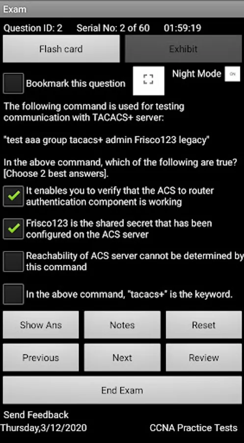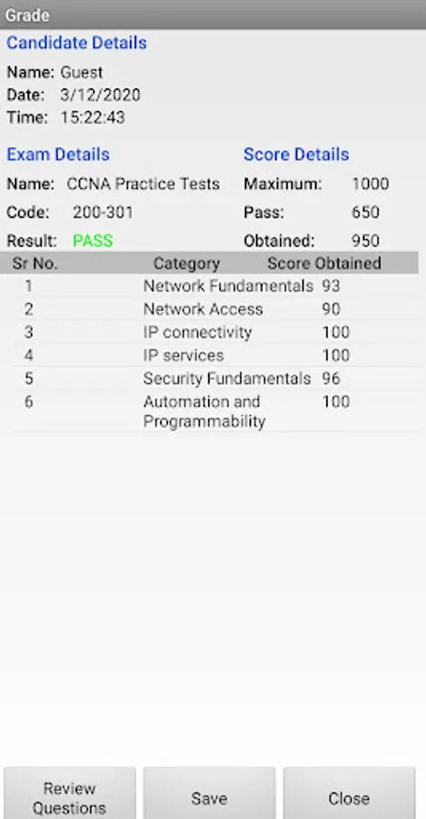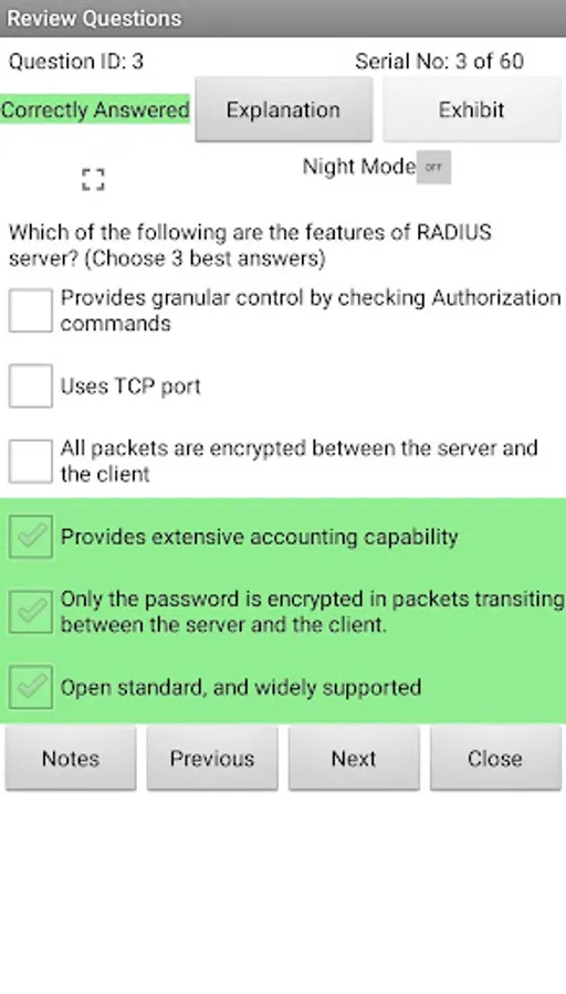 Complete explanation is provided for each question in Learn mode, and actual exam environment is simulated in Exam mode. Options to save the results and reviewing questions are provided.