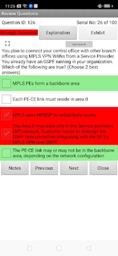 Complete explanation is provided for each question in Learn mode, and actual exam environment is simulated in Exam mode. Options to save the results and reviewing questions are provided.