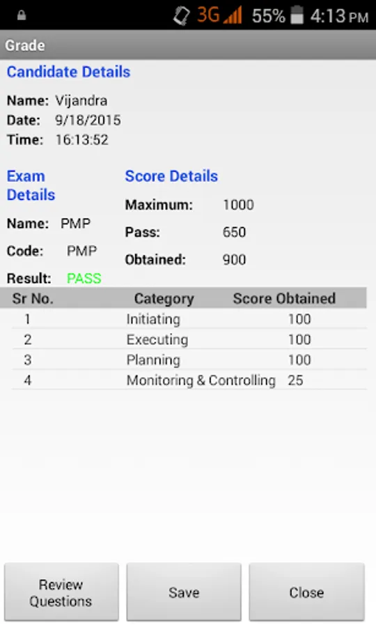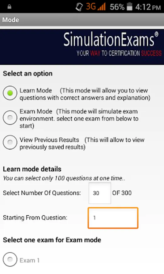 Complete explanation is provided for each question in Learn mode, and actual exam environment is simulated in Exam mode. Options to save the results and reviewing questions are provided.