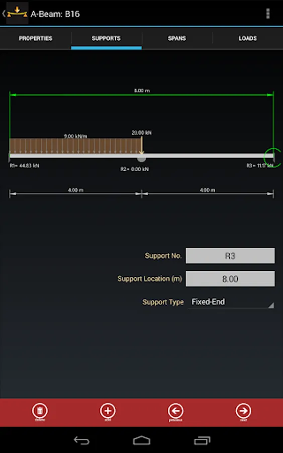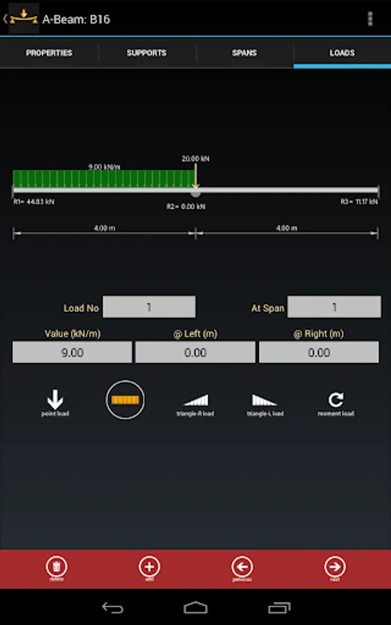 The great part of A-Beam is you are not limited to the only predefined of the pattern of the beams with particular support and load condition, but in A-Beam you can create your own beam with any combination of span and load condition no matter how complex it is. And create a beam and input the support and load condition is easy due to the interaction of the user interface which will show you the beam diagram while editing the data.