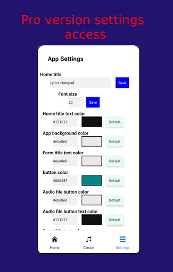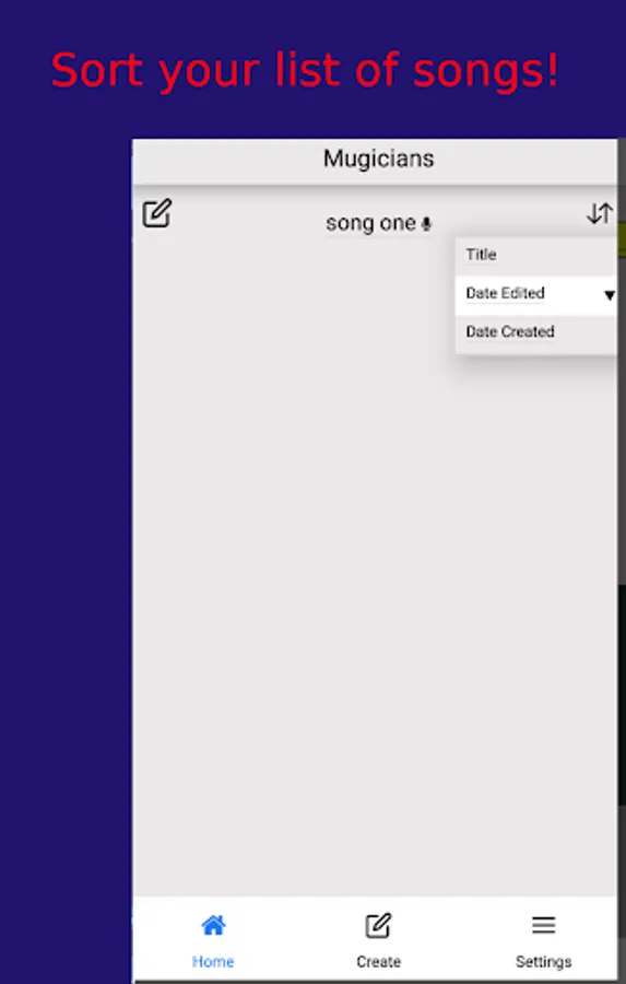 View your list of created songs in the home screen and sort by name and date. Press the created song to enter the edit screen where you can add audio, share your work, search for rhyming words with our lyrics helper tool.