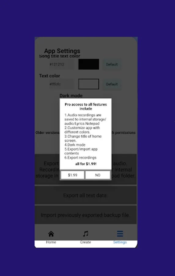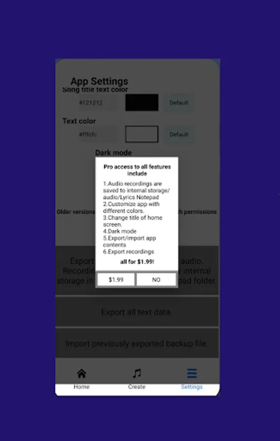 You are able to share your created lyrics and notes with friends either from the home screen, or from the edit screen menu.
