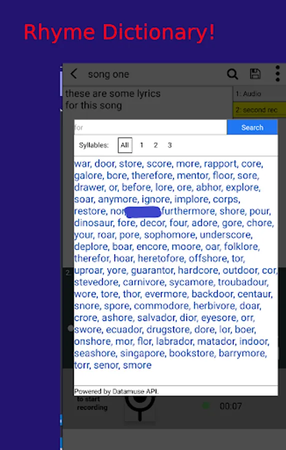 Search for words that rhyme to assist with writing songs and lyrics, and see their definitions as long as they are available. You are able to search the rhyming word results by syllables as well.