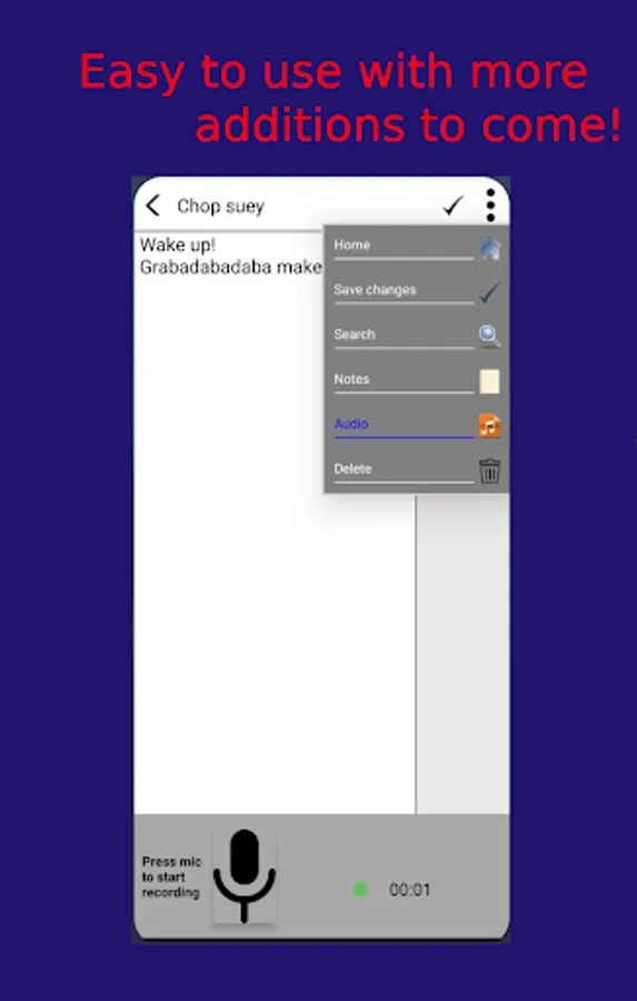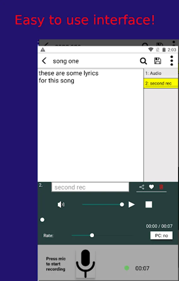 I always found my self using the stock note pad apps in my phone for writing down song ideas, but end up having a disorganized pile of mess! With this app, you get a list of your songs as soon as the app loads, and can add lyrics, notes, or audio recordings to each song.