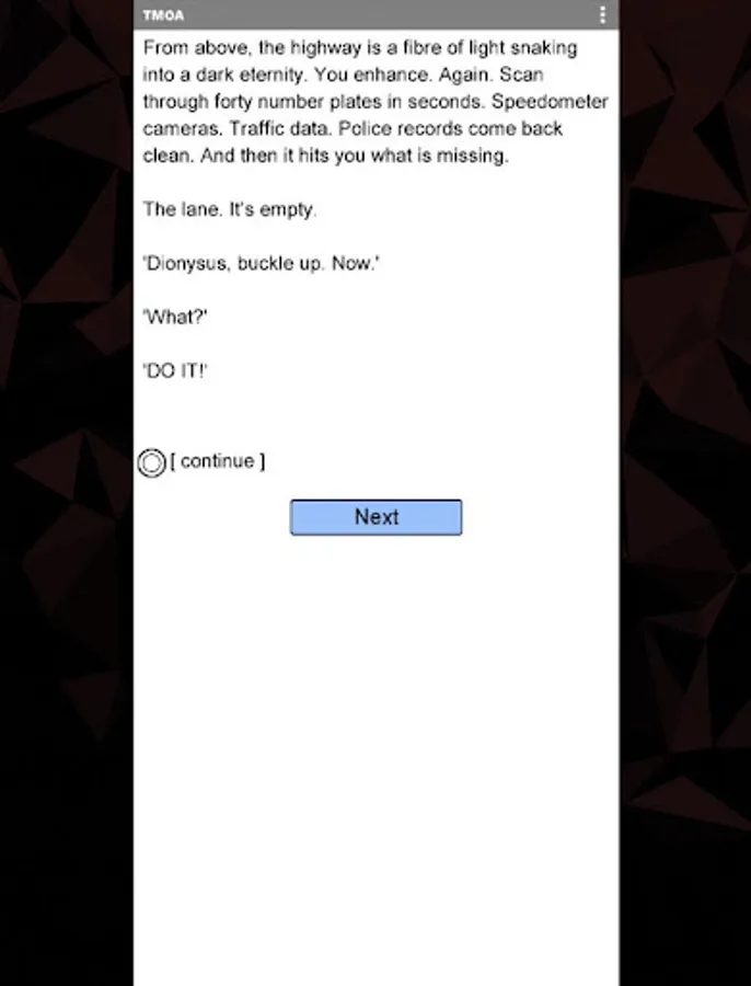 "The Masque Of Anarchy" is an 18 chapter interactive cyberpunk thriller by Edward Sills. It's entirely text-based, without graphics or sound effects, and fueled by the vast, unstoppable power of your imagination.