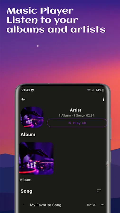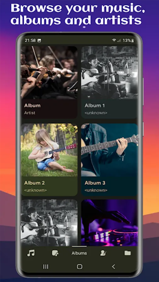 - Browse and play your music by Songs, Albums, Artists, Playlists, Genre