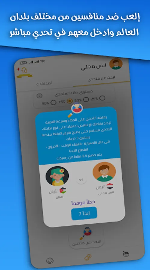 The World Challenge application relies on the person’s intuition speed by answering the question as quickly as possible to withdraw the opportunity to answer the other competitor.