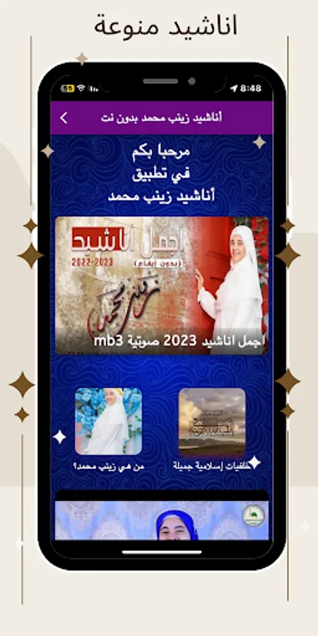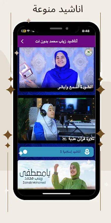 The application contains a variety of religious songs and recitations that will take you on an unforgettable spiritual journey. Enjoy the beautiful songs of the artist Zeina Mohamed and calm recitations with a gentle voice and wonderful intonation that attract the hearts.