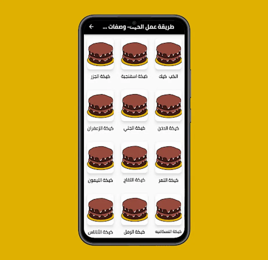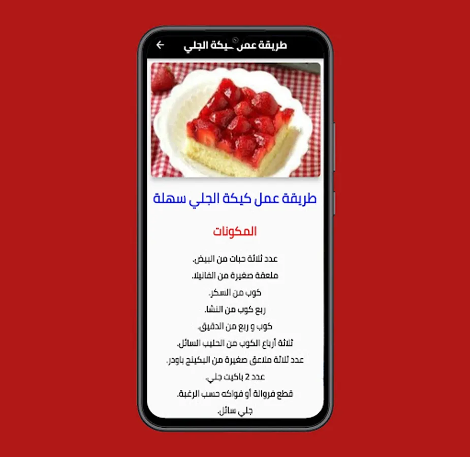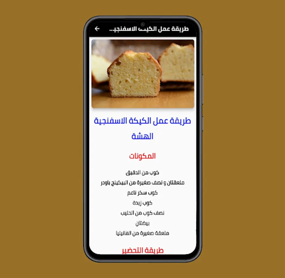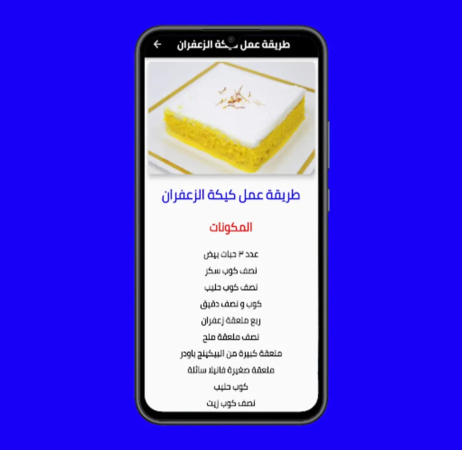 The application explains how to make sponge cake and carrot cake, in addition to lemon cake, orange cake, apple cake, pineapple cake, sand cake, millet cake, milk cake, and Vimto cake. It also contains recipes for saffron cake, cupcakes, lazy cake, and Nescafe cake. And chocolate cake, milk cake, jelly cake, and sand cake
