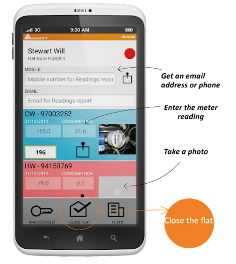 This Application is to be used for meter reading of cold water, hot water, central heating and electricity usage in flats. Staff executing meter readings enters values into application by taking a photo of meter, instead of noting on paper or other media. During the reading the user may be offline.