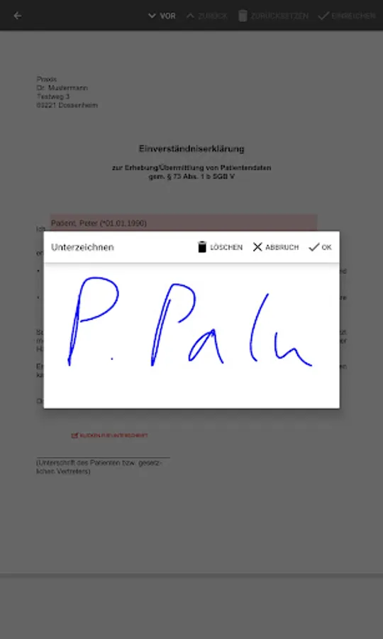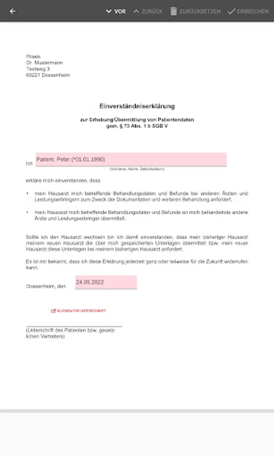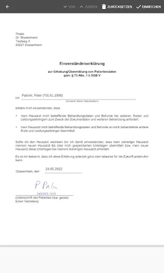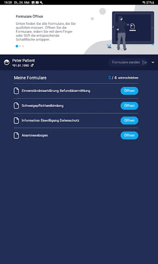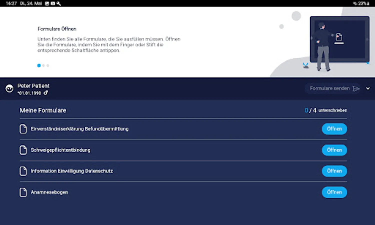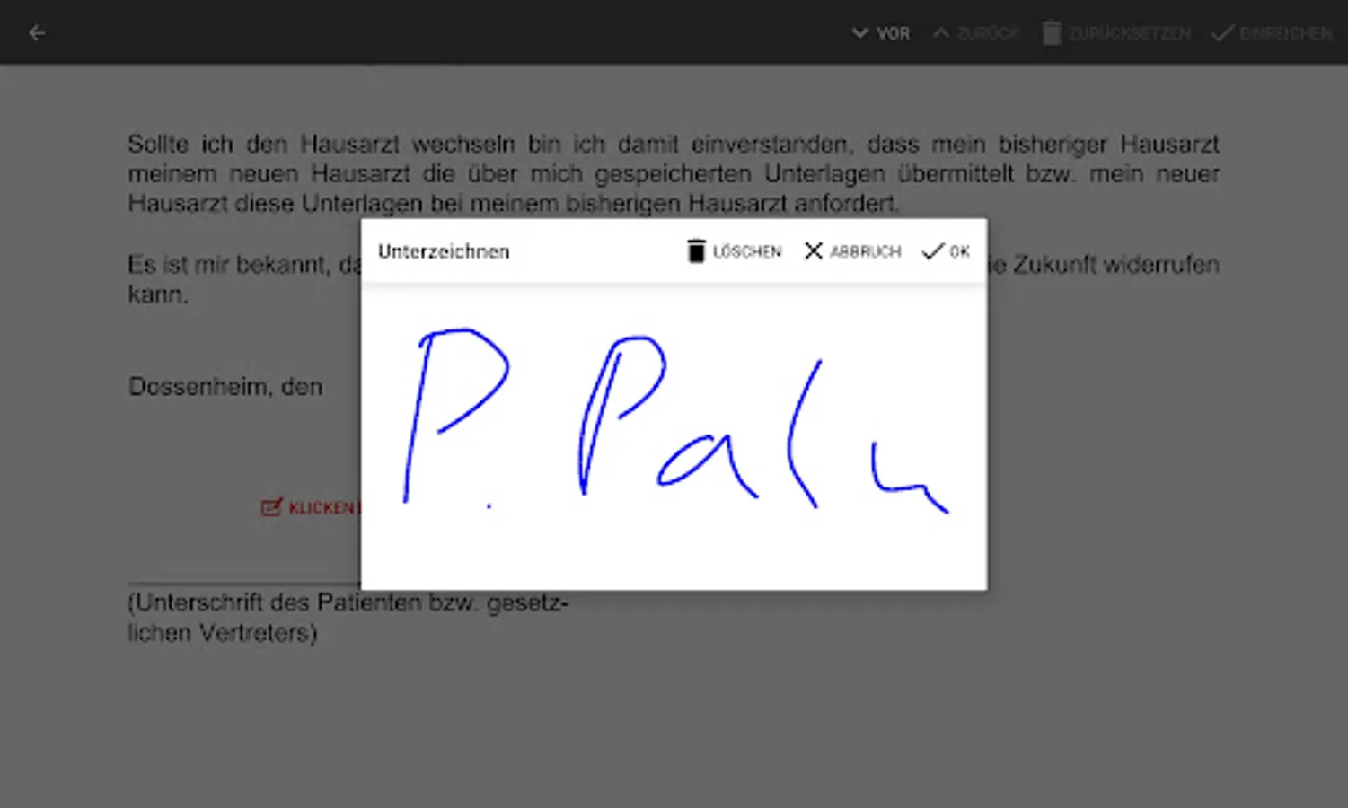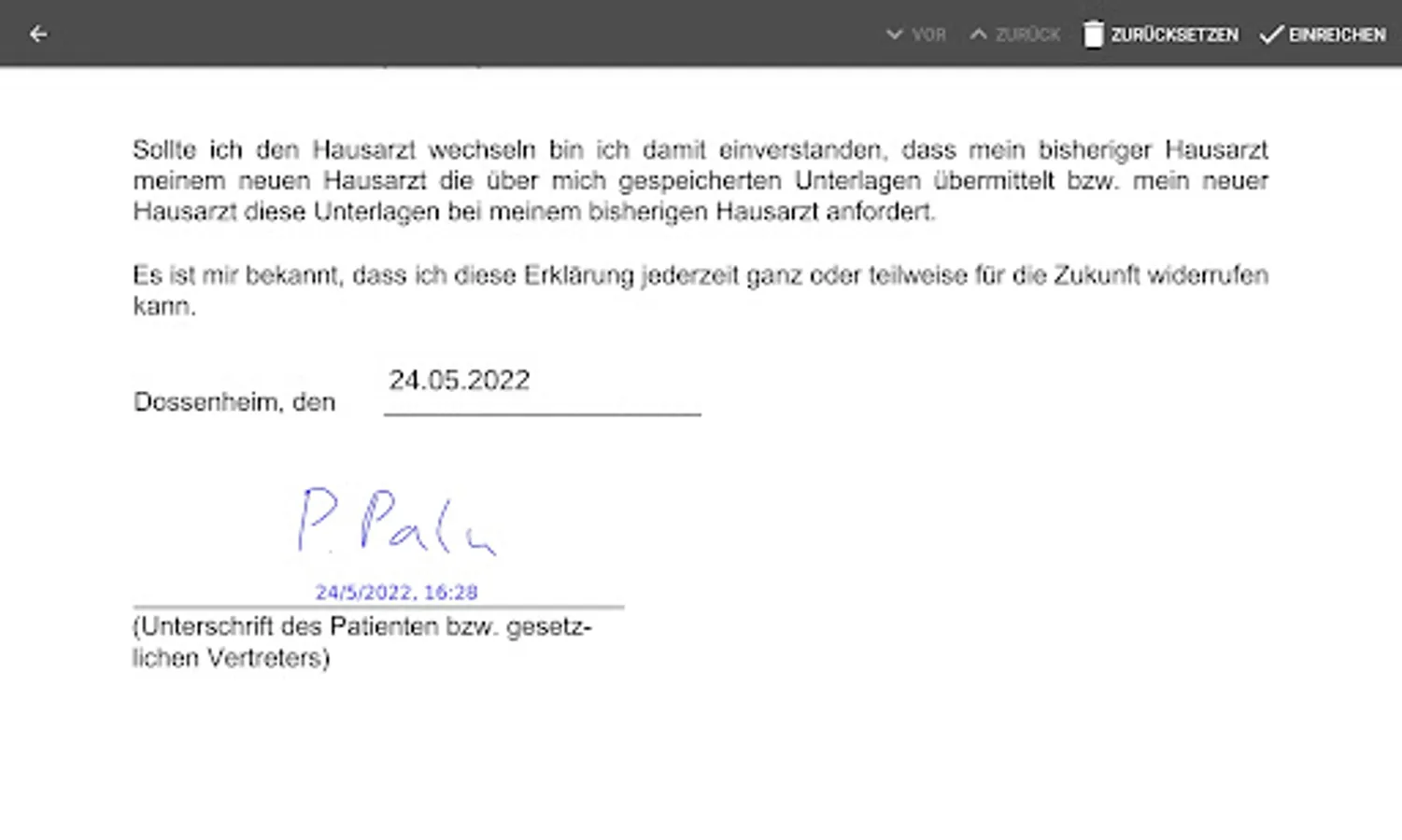 Your practice's own forms (e.g. declaration of consent to data transmission, IGeL contracts, treatment contracts, etc.) are available on a tablet on the mediDOK eForms app. Your patients can fill out and sign the forms digitally in the practice. Finally, the signed documents are saved in the mediDOK archive.