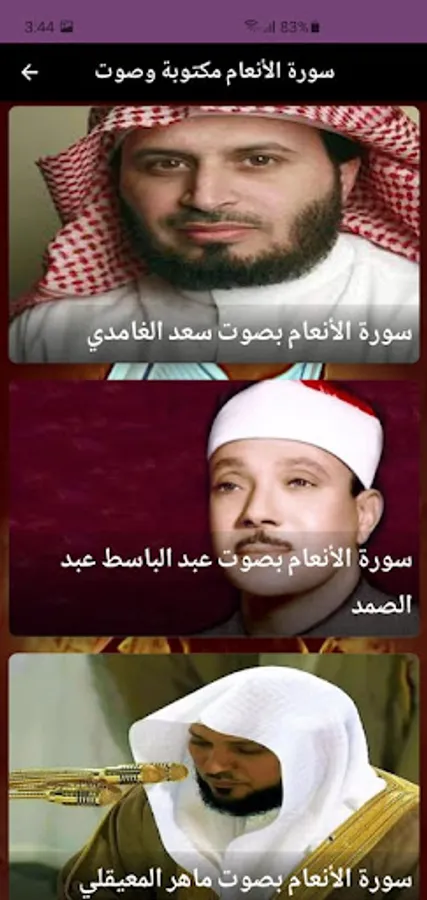 Surat Al-An’am is written and in a voice that I have returned to readers, including the reciter Mishary Al-Afasy, the reciter Abdul Basit Abdul-Samad, the reciter Saad Al-Ghamdi and the reciter Maher Al-Muaiqly. The application is very useful for those who want to hear