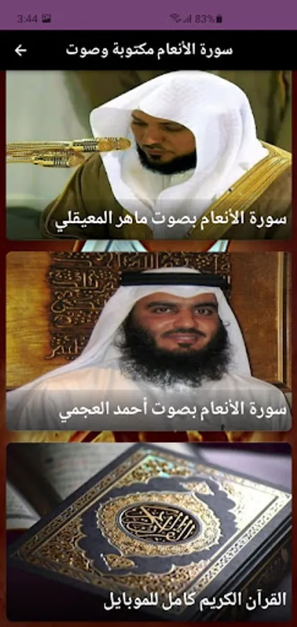 5- The application of Surat Al-An’am in the voice of the reciters, the reciter Mashari Al-Afasy, the reader Abdul Basit, the reader Saad Al-Ghamdi, and the reader Maher Al-Muaiqly contains Surat Al-An’am