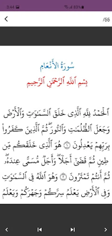4- A simple user interface that enables you to listen and read Surat Al-An'am written in a clear font with ease