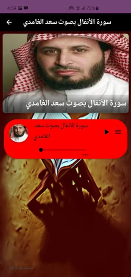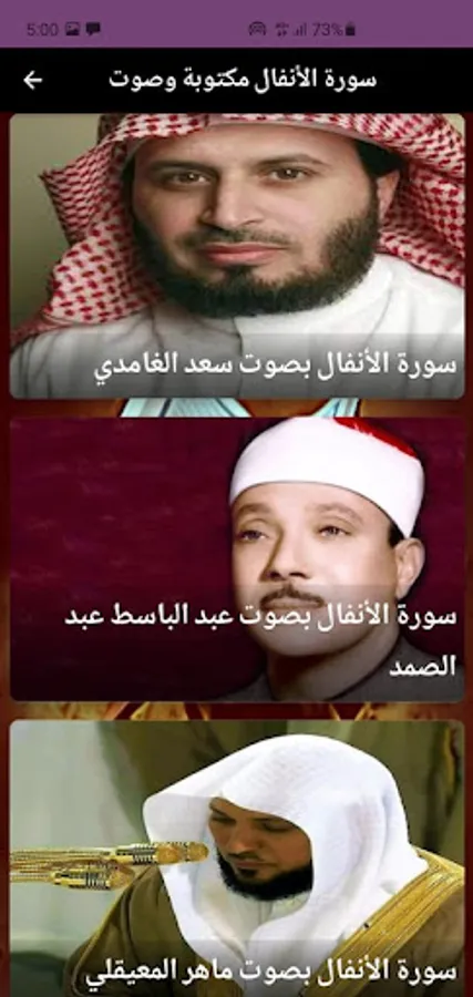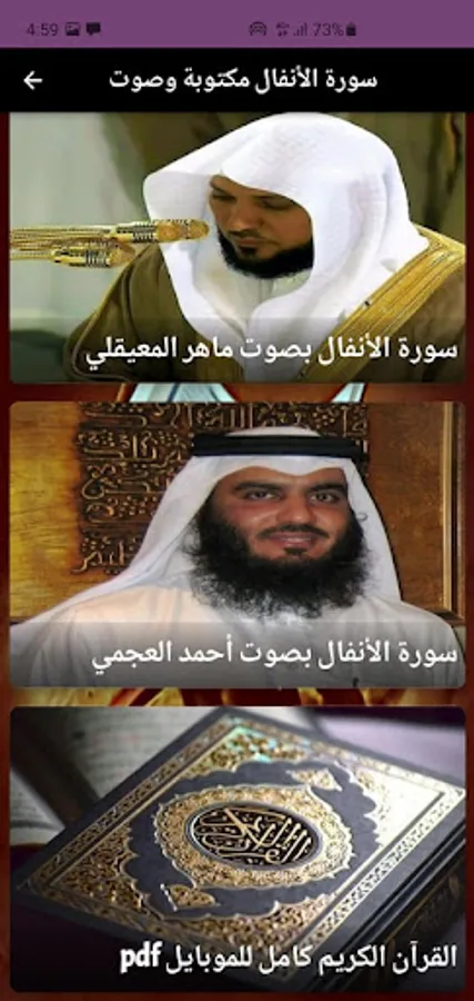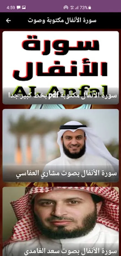 5- The application of Surat Al-Anfal with the voice of the reciters, the reciter Mashari Al-Afasy, the reader Abdul Basit, the reader Saad Al-Ghamdi, and the reader Maher Al-Muaiqly contains Surat Al-Anfal