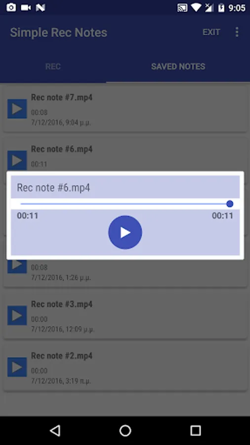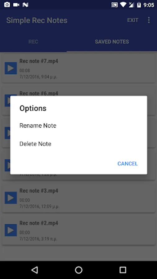 The recorded files are saved as .mp4 type and they appear as a list view where you can rename or delete them.