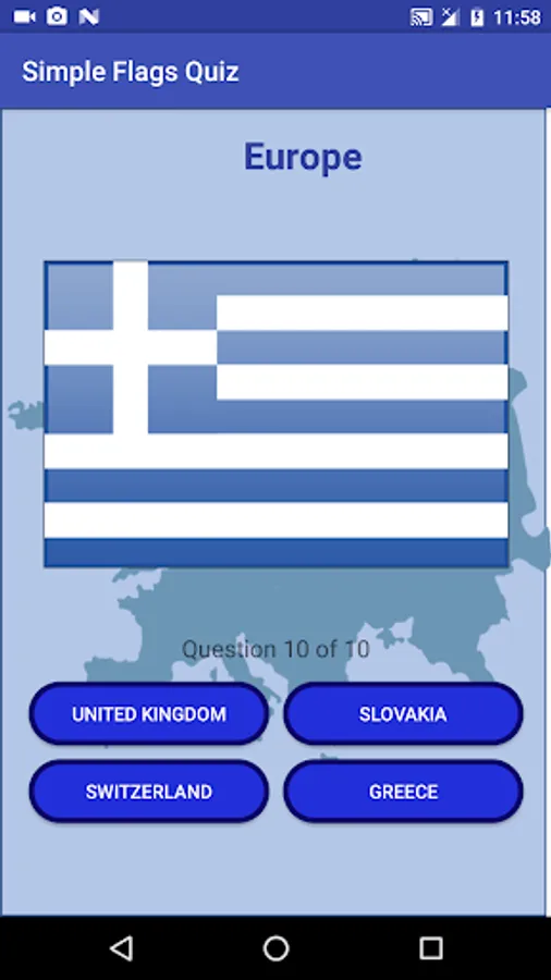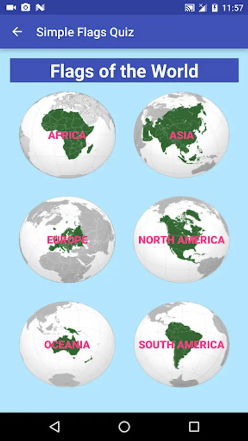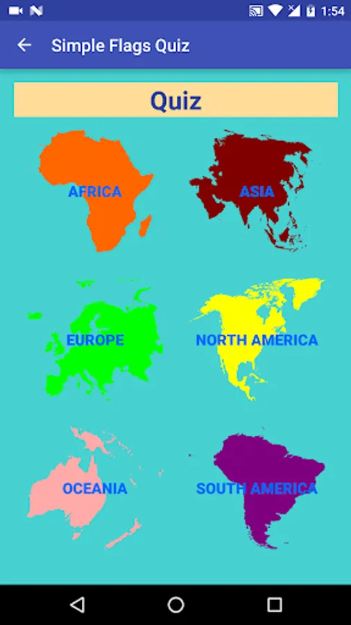 - The second part is a simple quiz. First you choose the continent you want and then you start the quiz of 10 questions. After each session you can see your score.
