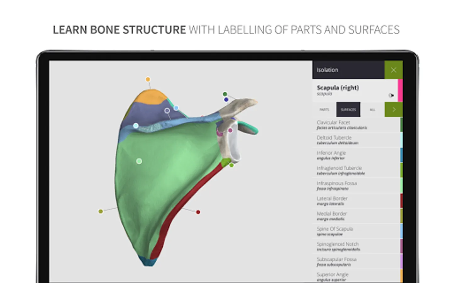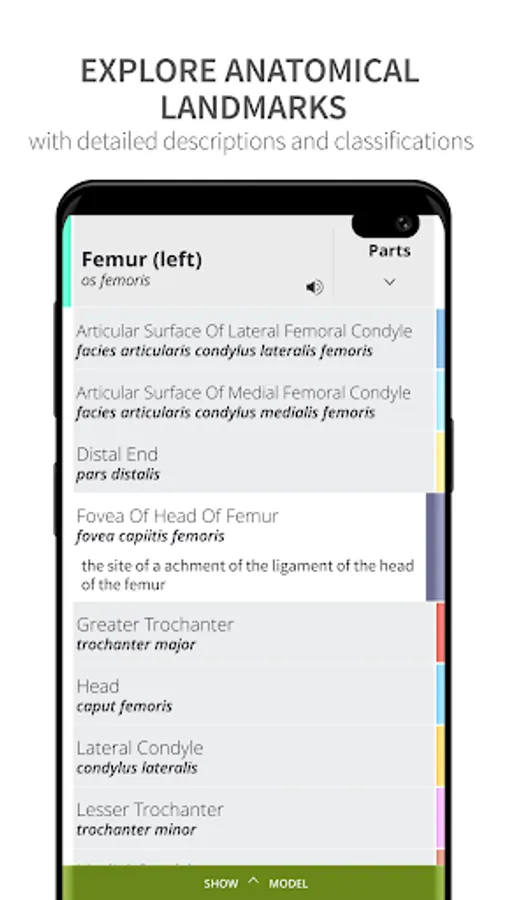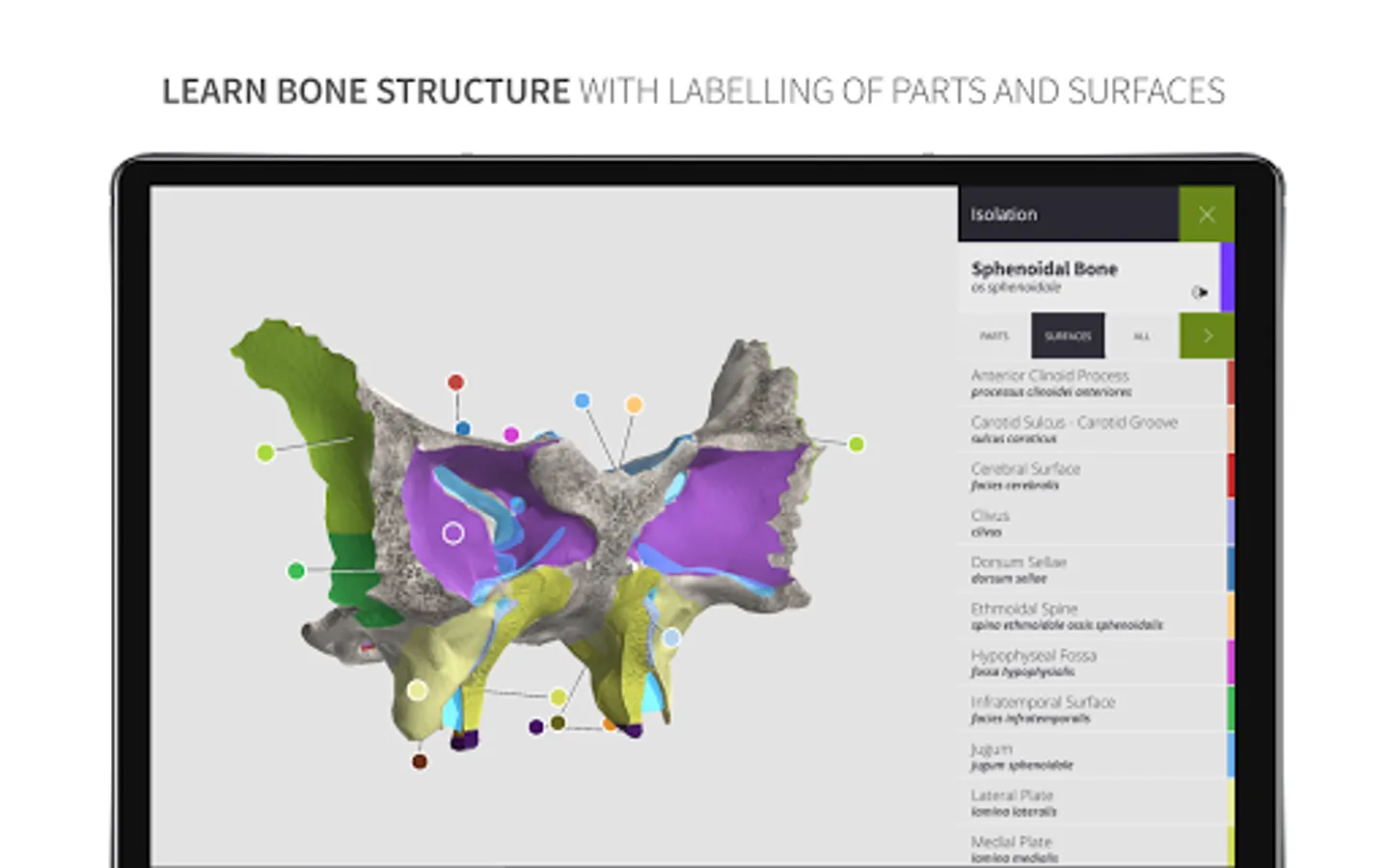A List of Landmarks is pinned directly to the corresponding bones with description, visualized foramens and classification. You can also view them by hierarchy.
