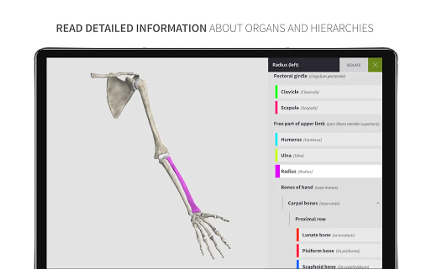 Explore the skeletal system with descriptions, clinical notes, and general information about bones with over 4000 parts, surfaces and foramina including proper organisational hierarchies, and use all of the interactive tools for free.