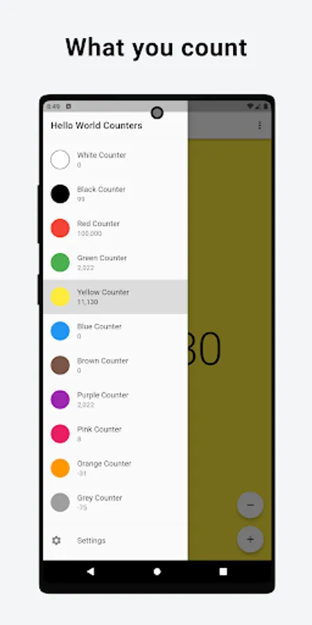 Hello World Counters is an easy to use tally counter app for Android. It gives you a different counter for each of the unambiguous color terms in English: White, Black, Red, Green, Yellow, Blue, Brown, Purple, Pink, Orange, and Grey. This means you can count people, sheep, kisses, or smiles, and nobody will know what you are counting!