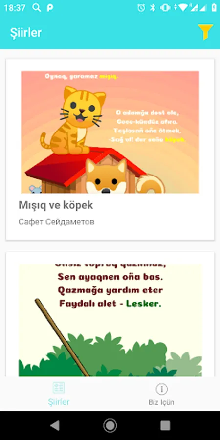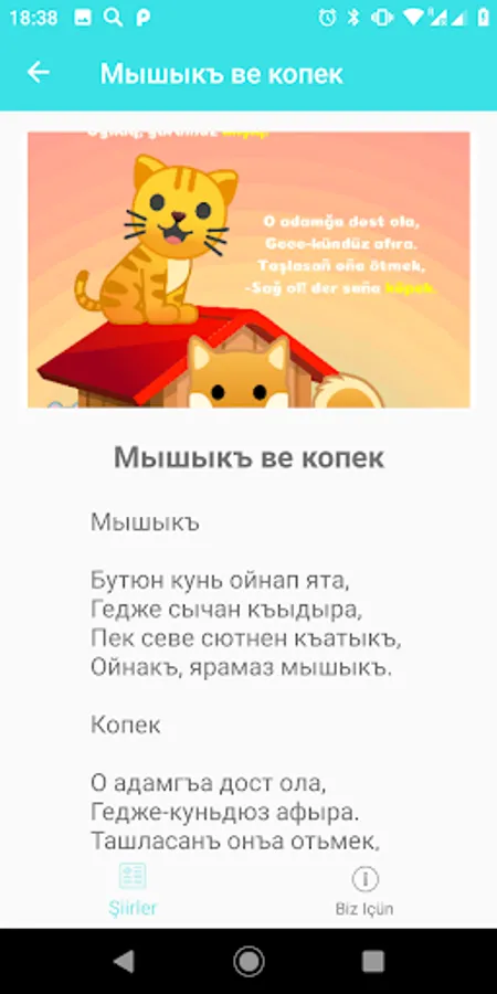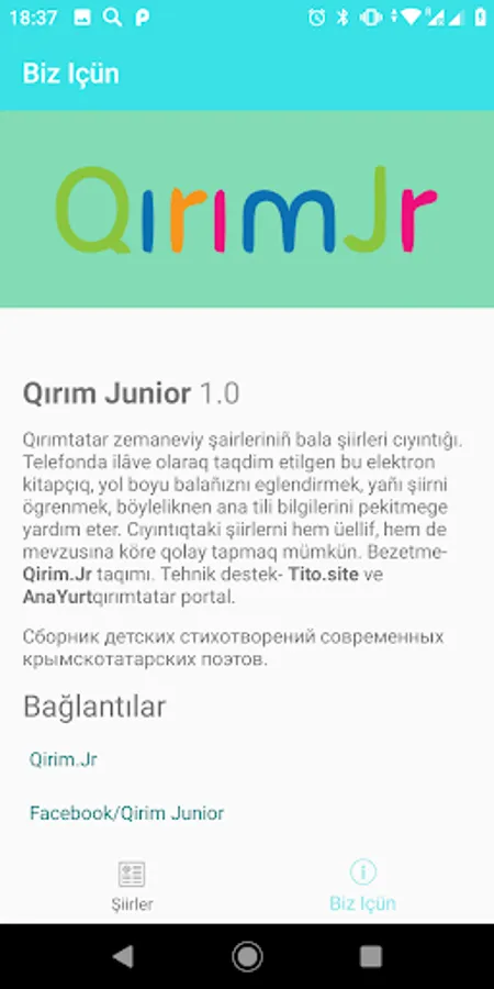 A collection of children's poems of modern Crimean Tatar poets. A convenient book on the phone will help entertain the child on the road, or learn a new poem, as well as strengthen knowledge of the native language. The collection is convenient for searching poems both by authors and by various topics. Design by Kyrym Junior team. Technical support - Tito. Site and Crimean Tatar portal Ana yurt.