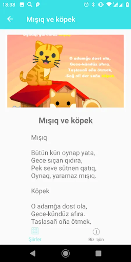 Qırımtatar zemaneviy şairleriniñ bala şiirleri cıyıntıĝı. Telefonda ilâve olaraq taqdim etilgen bu elektron kitapçıq, yol boyu balañıznı eglendirmek, yañı şiirni ögrenmek, böyleliknen ana tili bilgilerini pekitmege yardım eter. Cıyıntıqtaki şiirlerni hem üellif, hem de mevzusına köre qolay tapmaq mümkün. Bezetme- Qirim.Jr taqımı. Tehnik destek- Tito.sait ve AnaYurt.Com qırımtatar portal
