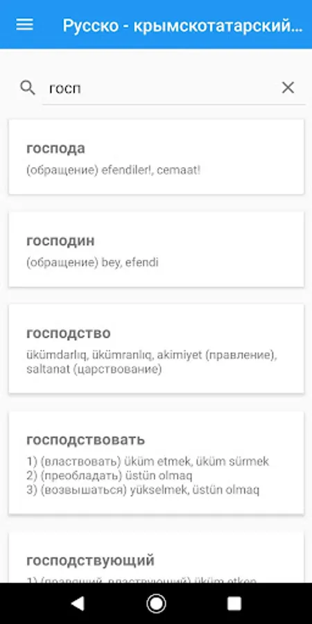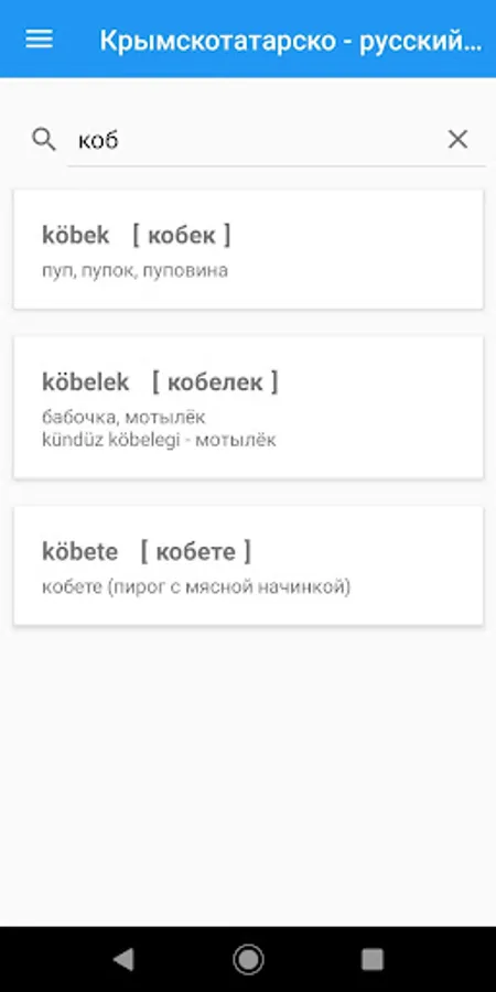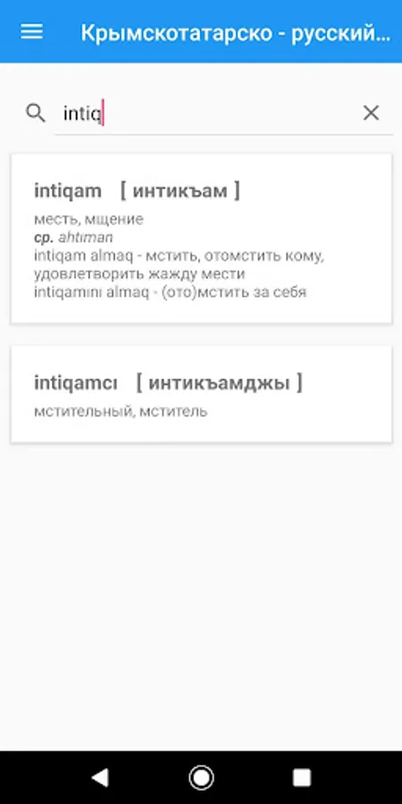 Crimean Tatar Dictionary, which will simplify the life of all who are interested in the Crimean Tatar language. This is one of the most comprehensive dictionaries currently available. Our dictionary is provided in both Latin and Cyrillic, which will simplify the search for the necessary words.