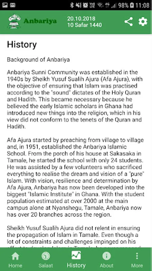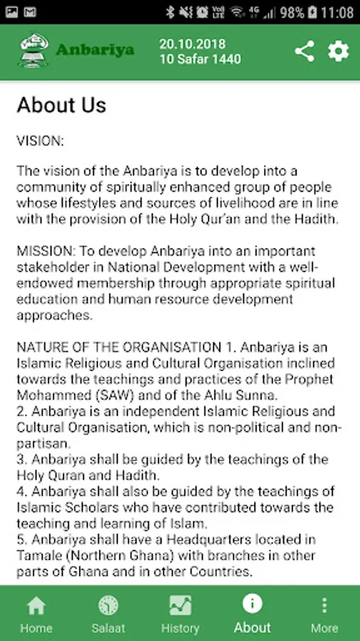 The vision of the Anbariya is to develop into a community of spiritually enhanced group of people whose lifestyles and sources of livelihood are in line with the provision of the Holy Qur’an and the Hadith.