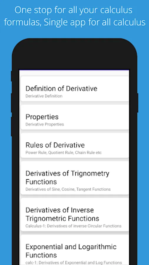 FREE & OFFLINE || The only formula app you will need while studying calculus. This app is a must have cheat sheet for any student studying calculus, It has a great well organized user interface for easy browsing and looking for the desired formula. This app include Trigonometry Formulas