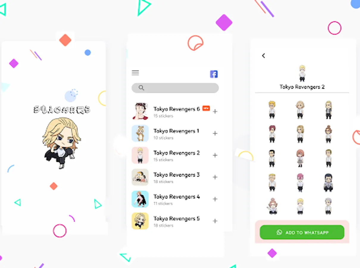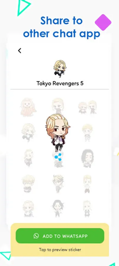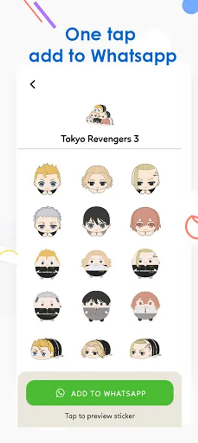 This app provide a huge sticker pack of Tokyo Revengers such as Takemichi Hanagaki, Manjiro Sano, Ken Ryuguji, Naoto Tachibana, Hinata Tachibana, Masataka Shimizu, Takashi Mitsuya, Atsushi Sendo, Tetta Kisaki, Shuji Hanma, Haruki Hayashida, etc.