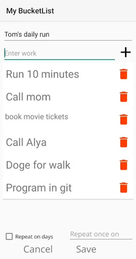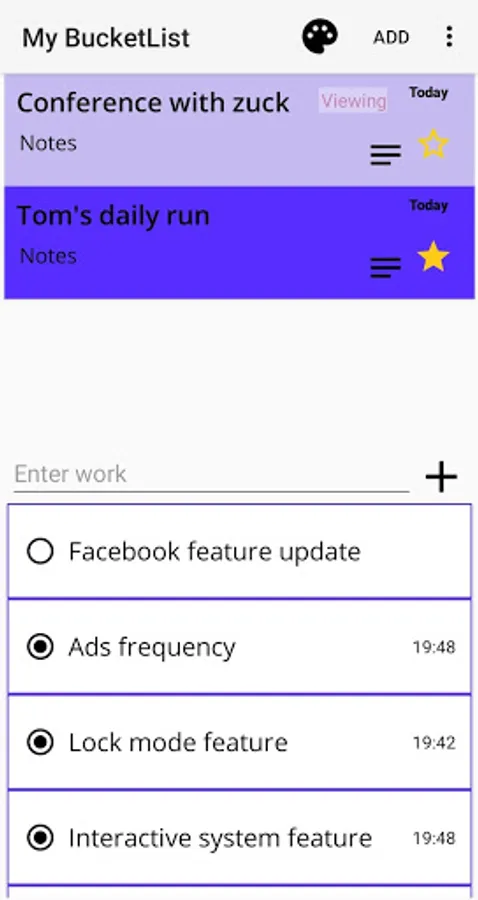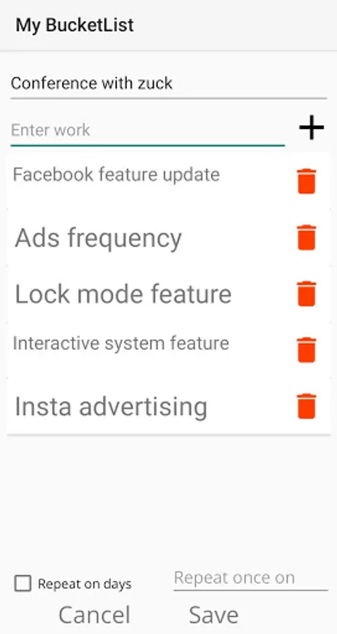 'My BucketList' is a cool app that helps you maintain your work at ease, so you do not repeat the same work but focus on new ones, this simple and amazing tool helps you to repeat works on a weekly and daily basis helping you to be productive on all days of the week, even as your works are done previously will not be deleted, so you do not have any mess in searching through the history.