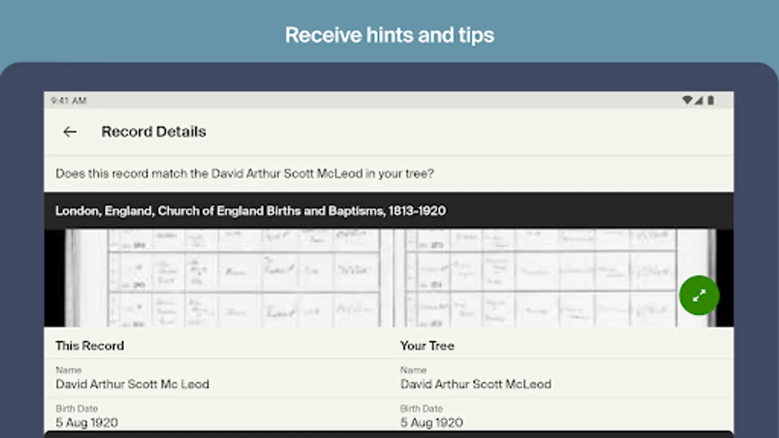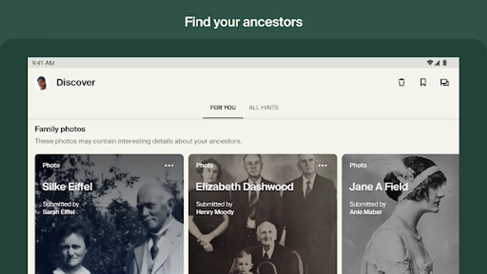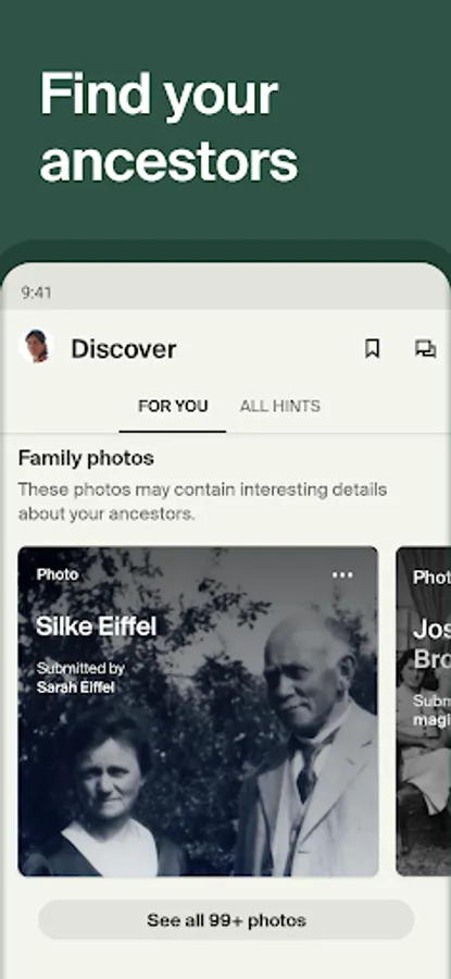 • Discover stories, photos, and records about your ancestors with Ancestry Hints®