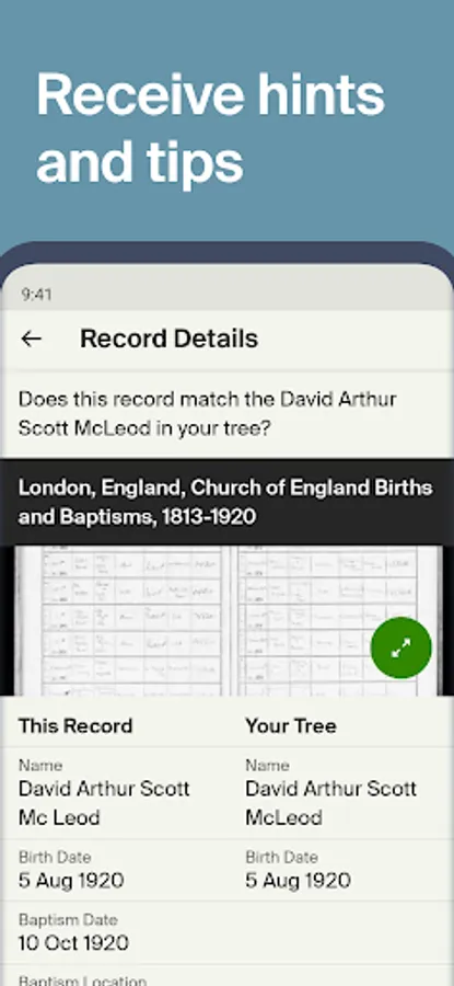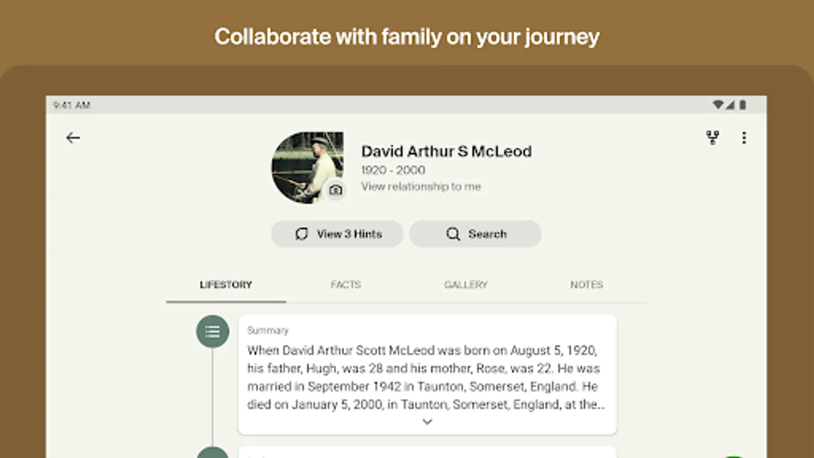 • Add photos, hints, or ancestor stories and watch your personalized family tree grow