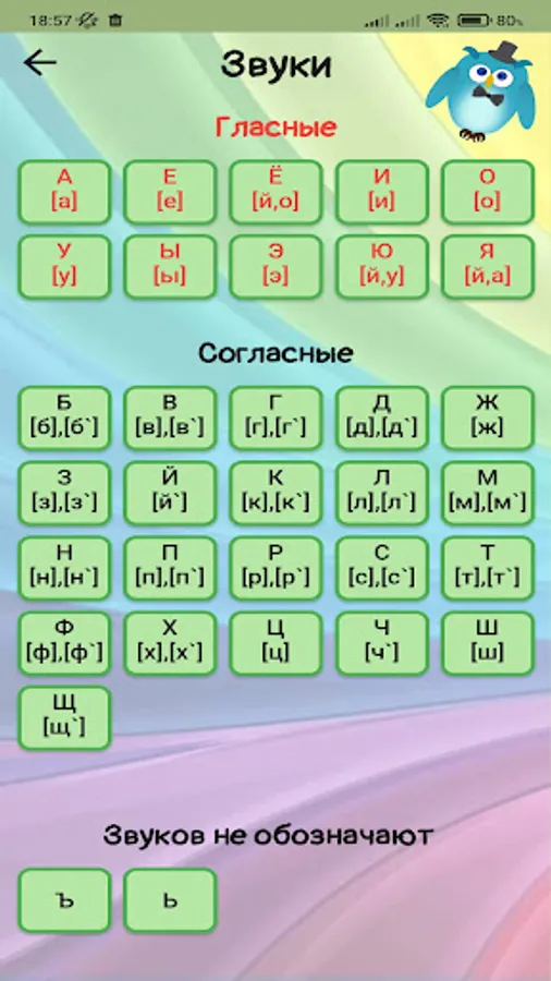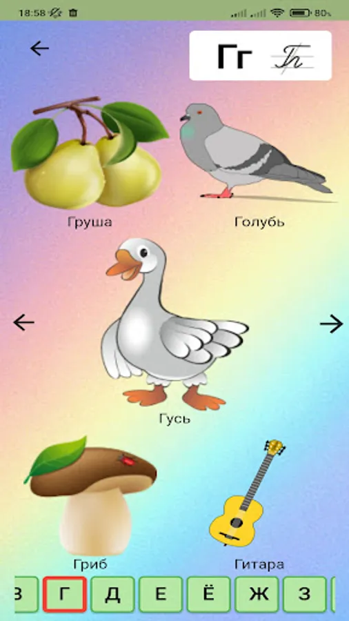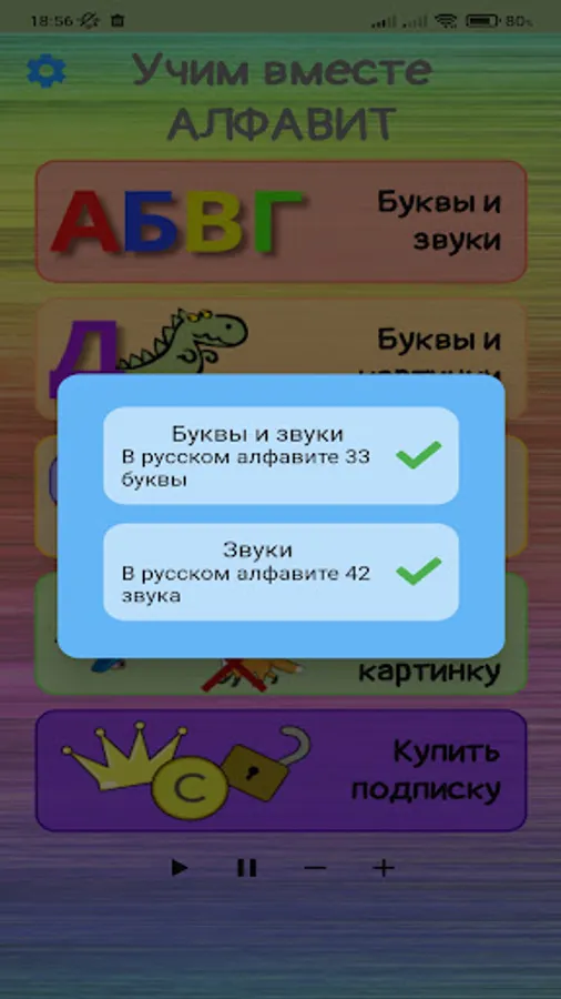 It has different modes of learning and playing: the kid can learn letters, sounds, words (for this, the application has voice acting for both letters and sounds), and also try himself in finding the correct letter and an extra picture.