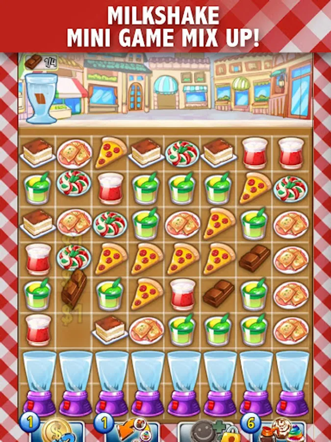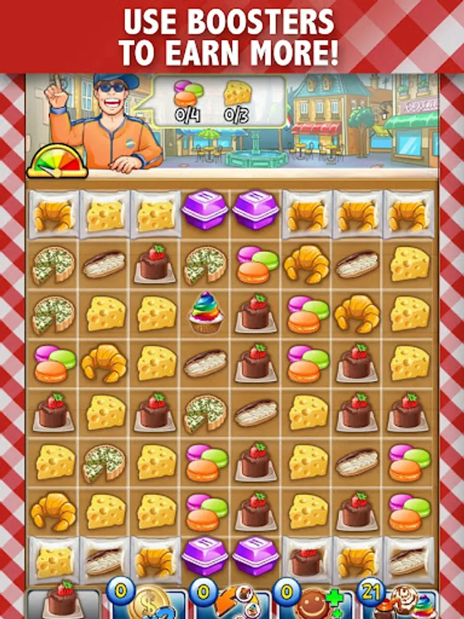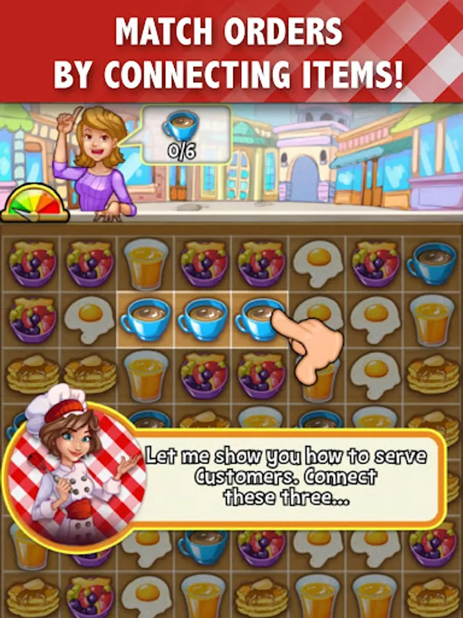 Match orders by connecting 3 or more of the same food tile in the fewest number of moves possible! Boost your earnings and save moves by serving more than one order with a single match!