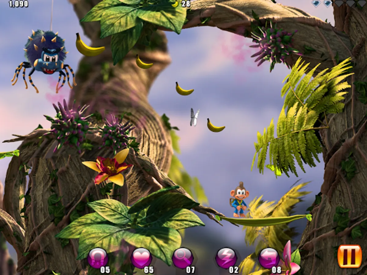 Chimpact 2 Family Tree is like pinball but with monkeys! Guide Chuck the Chimp, along with other family members, through this scrolling platformer and its ever-changing jungle landscapes while collecting items and tackling various critters and the environment along the way. Collect bunches of bananas, that convert into coins to collect even more power-ups and enemies to ensure you find all the hidden gems. Discover secret paths, avoid dangerous obstacles, play mini games and time your jumps to perfection in this gorgeous jungle adventure!
