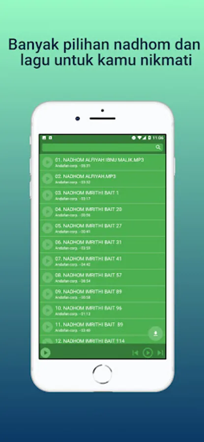 The Latest Nadhom Alfiyah Ibnu Malik Mp3 Offline application has a simple design and is easy to use. It can also be installed on all versions of Android. And this Offline Mp3 application is also very light with an equalizer feature to adjust the sound according to your taste.