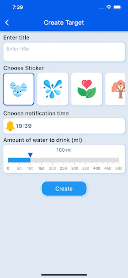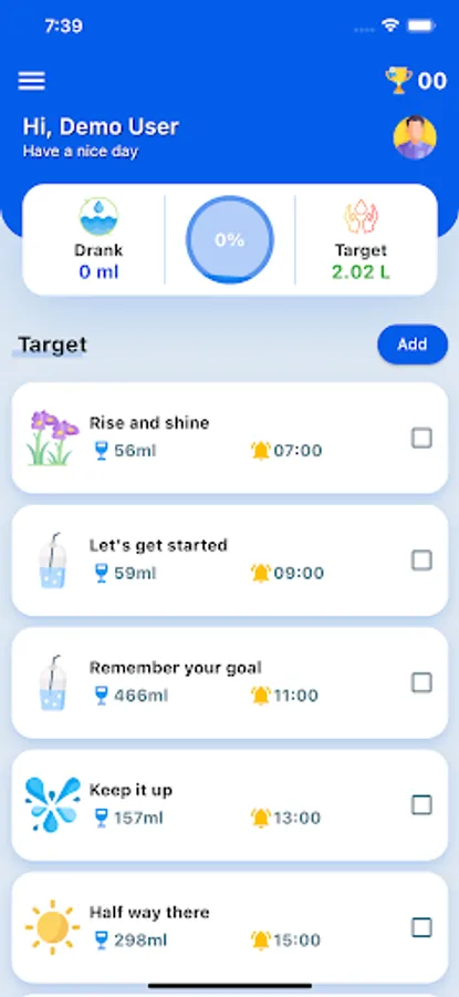 The application allows users to set a goal of drinking water during the day according to each defined time frame.