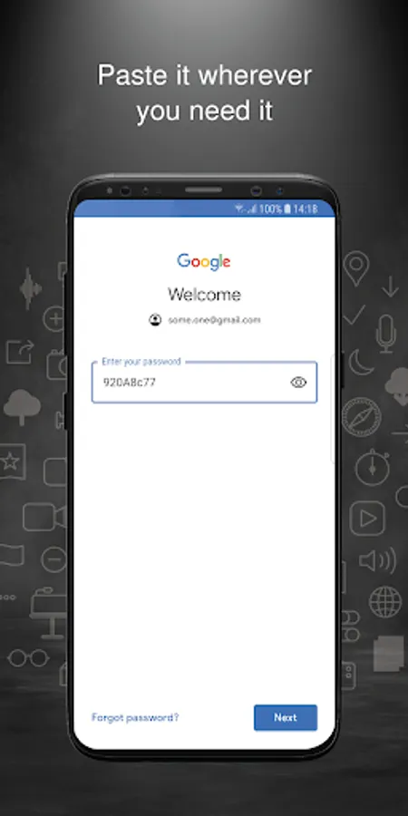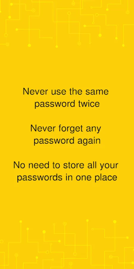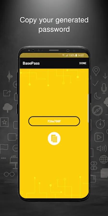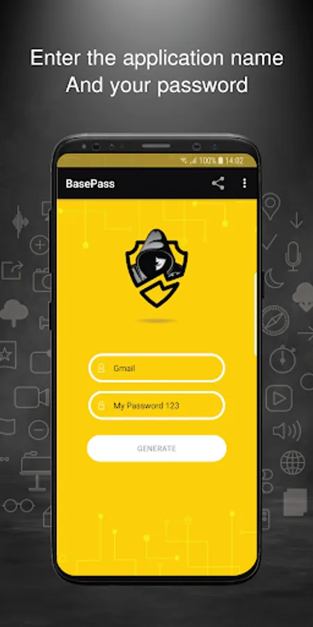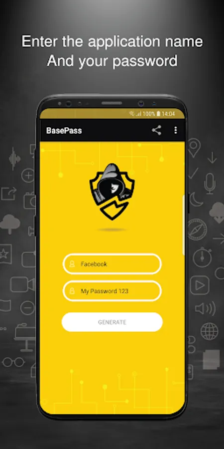 For each app/ site, you will have to insert your one and only password (the base password) and the name of the app/ site. BasePass will use a hash, to encrypt the combination of the password together with the account's name. The result will be a strong password for this app/ site.