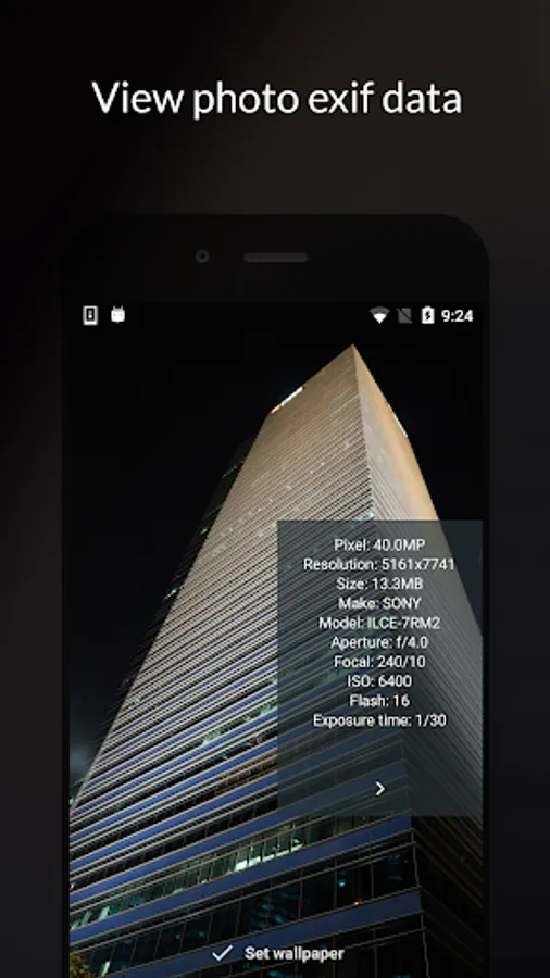 Silax helps you to view the photo detail data (Exif data viewer: ISO, aperture, light source, exposure time, gps location info, etc)