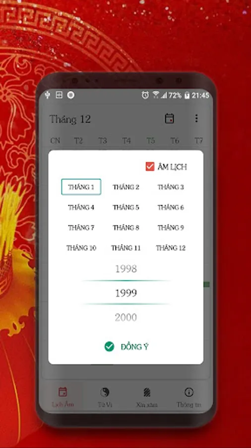 - Hiển thị lịch âm dương, chọn nhanh tháng Âm lịch (ÂL) hoặc Dương lịch (DL)