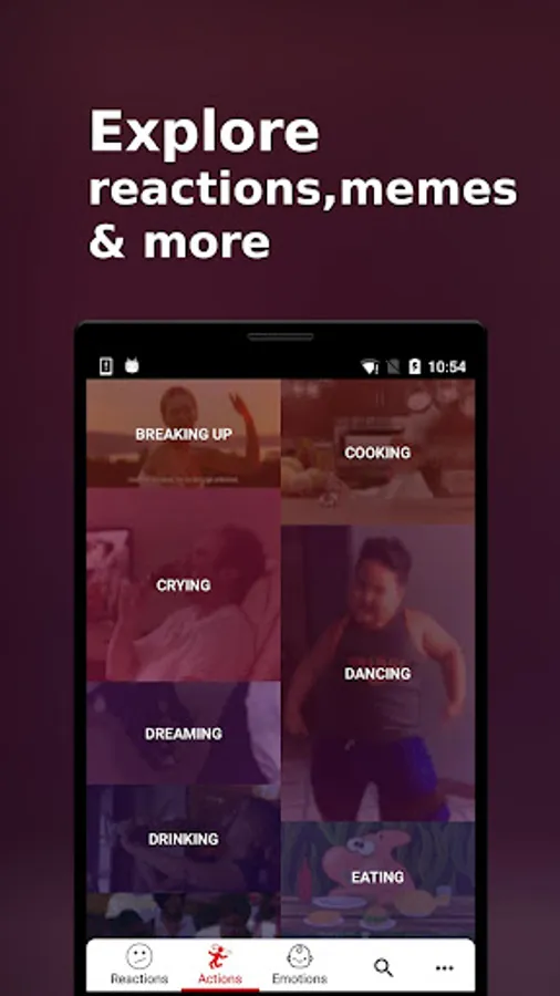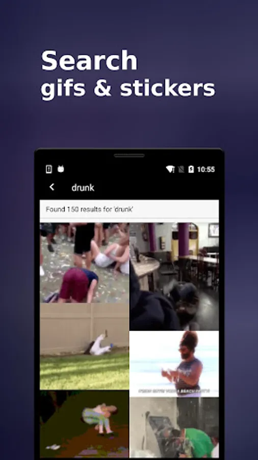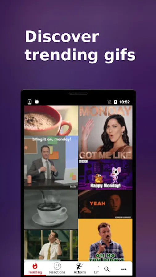 • Explore gifs from many topics (reactions, actions, memes, tv, stickers, gif with text...)
