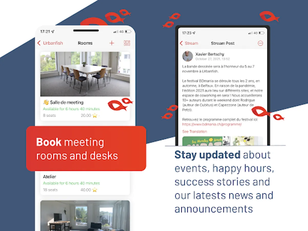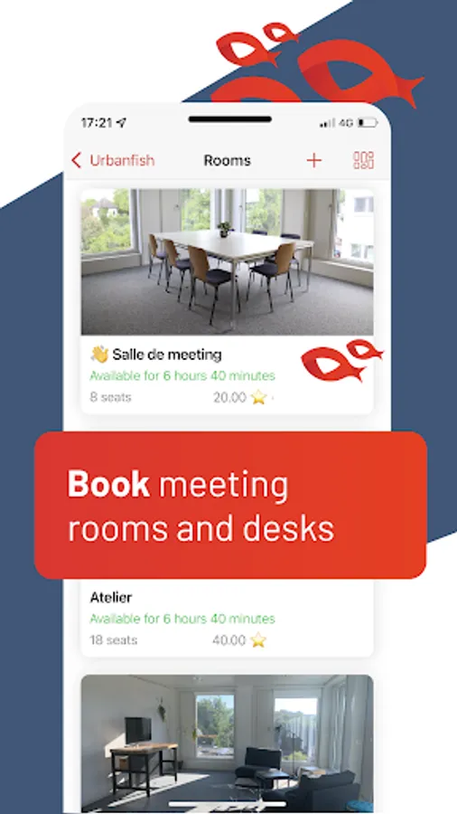 • Book meeting rooms with personal and team credits, as well as credit cards.