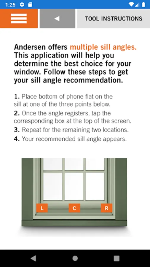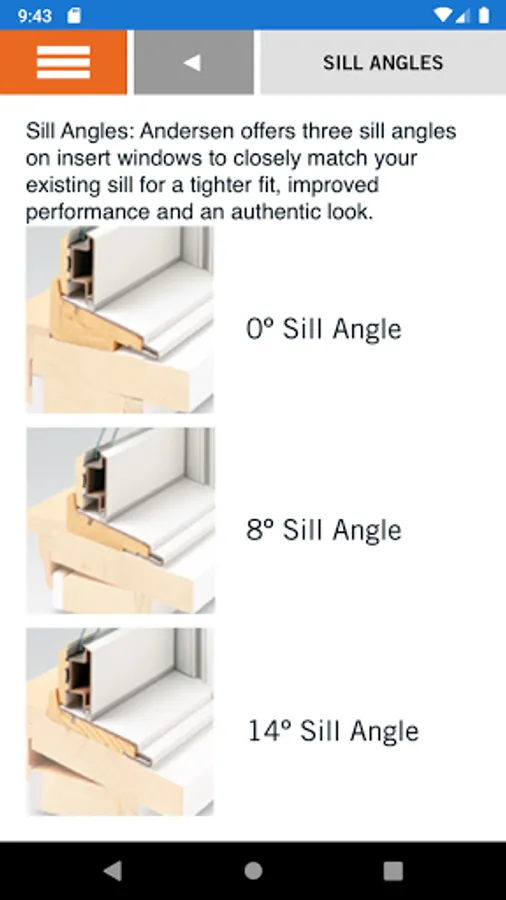 The Andersen Sill Angle Finder app helps you determine the sill angle (sill slope) of an existing window. Knowing the existing sill angle will help determine which sill angle you should select when ordering Andersen® replacement double-hung windows. © 2015 Andersen Corporation