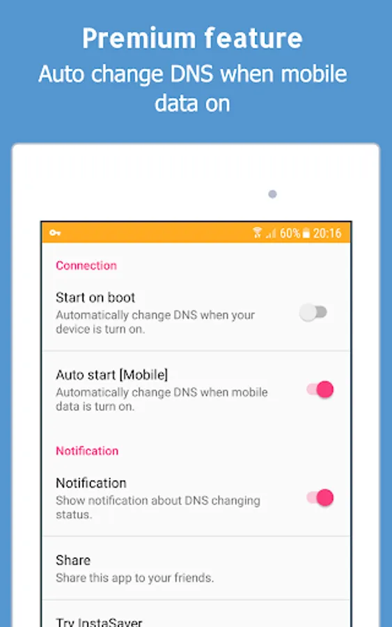 Change DNS is the most powerful DNS Changer tool. It doesn't require root and works on both Wi-Fi and Mobile Data connection.