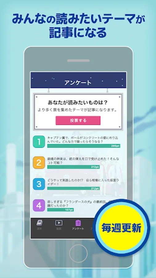 毎週アンケートを実施し、人気のあったテーマを次週に配信します。