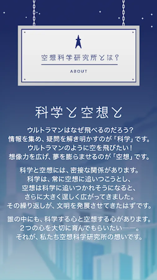 ニュートンは「リンゴは落ちるのに、なぜ月は落ちてこないのだろう?」と考えて、万有引力などの科学の体系を打ち立てました。アインシュタインは「光の速さで走る列車で光を追いかけたら、何が見えるんだろう?」と想像して、相対性理論を築き上げました。人間の想像力が科学を進歩させ、科学は想像の世界を実現に導く――。そう信じて、私たちは今日も、空想と科学の研究を行っています。