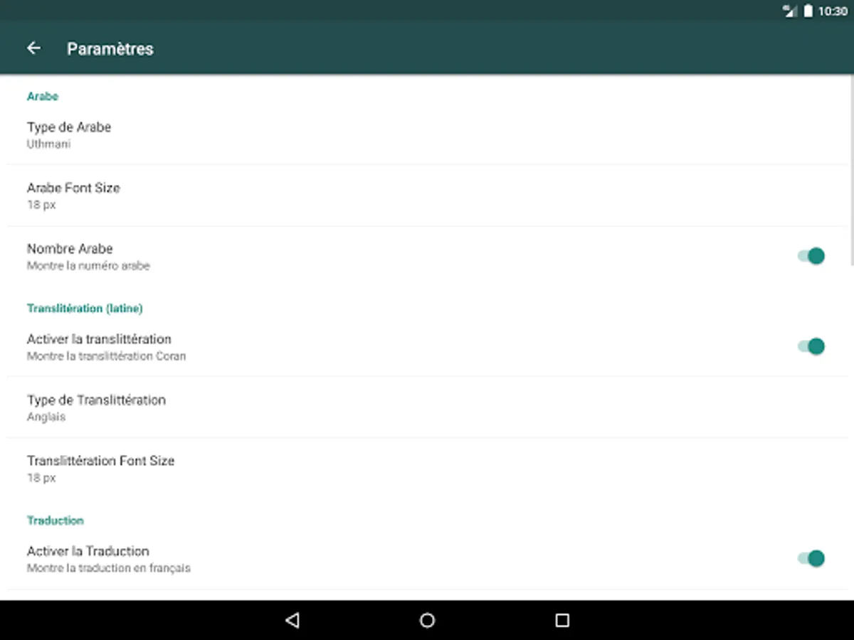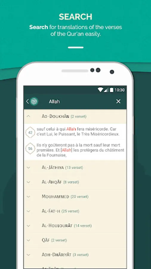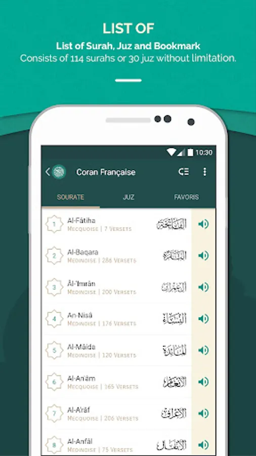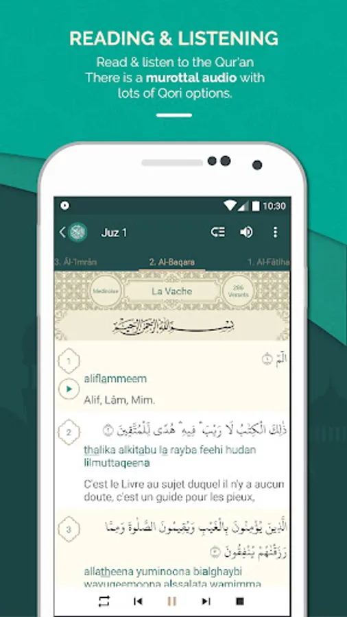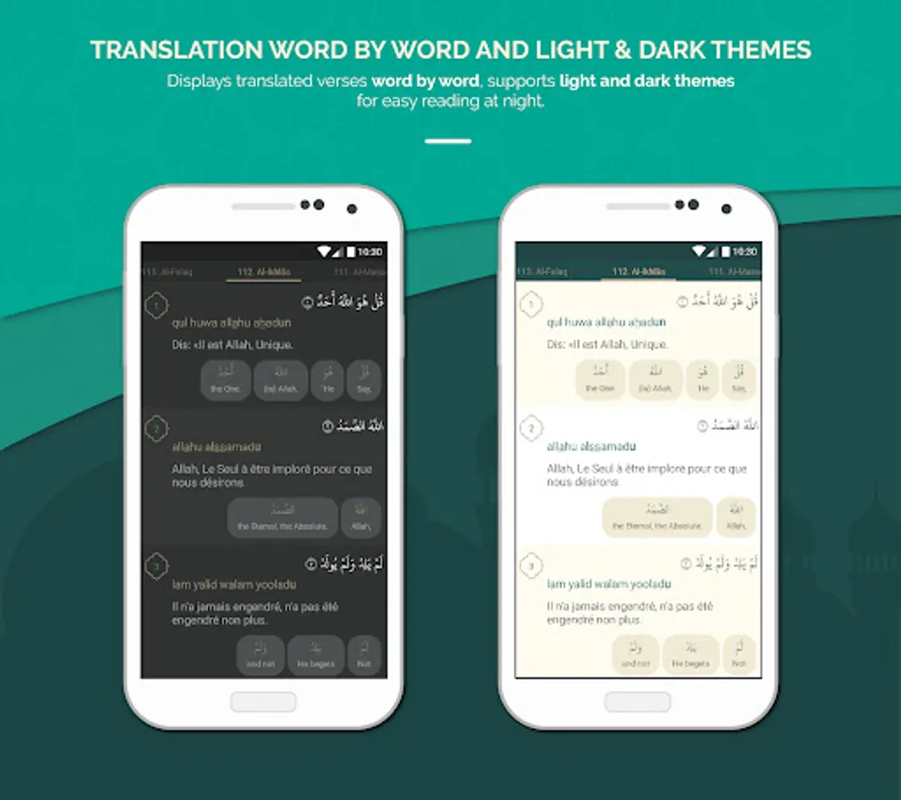 Digital Quran / Coran with French translation, which has a word by word translation in English and audio mp3 murattal full Quran 114 Surah or 30 Juz without limitation.