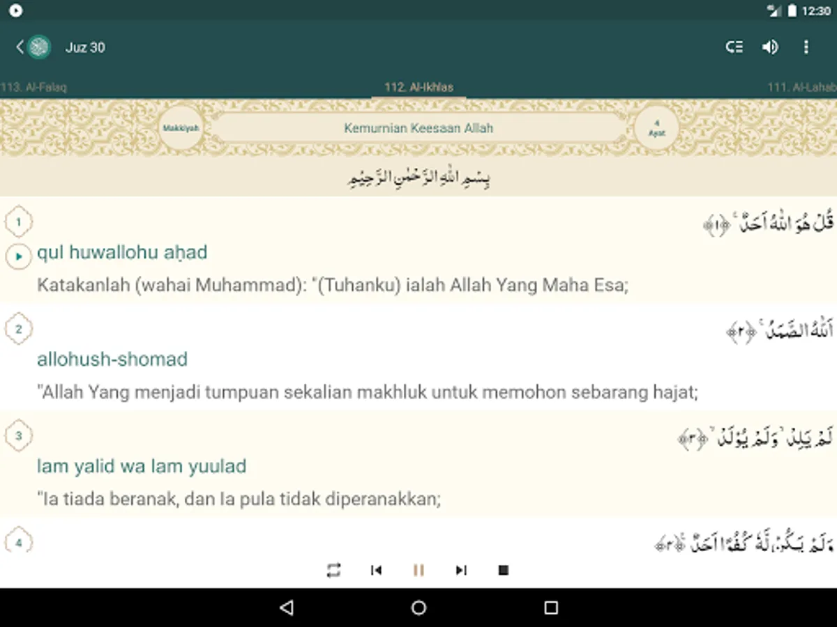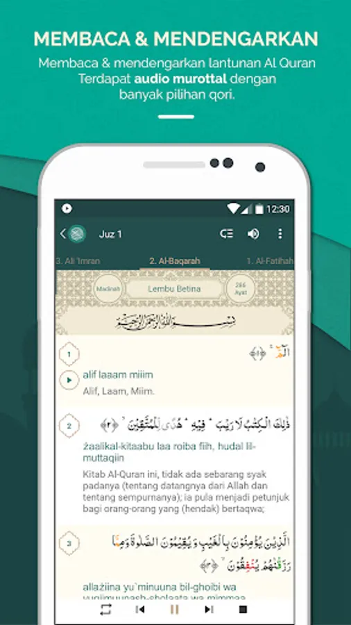 - Control suara (play, pause, stop, next ayat, prev ayat, repeat).